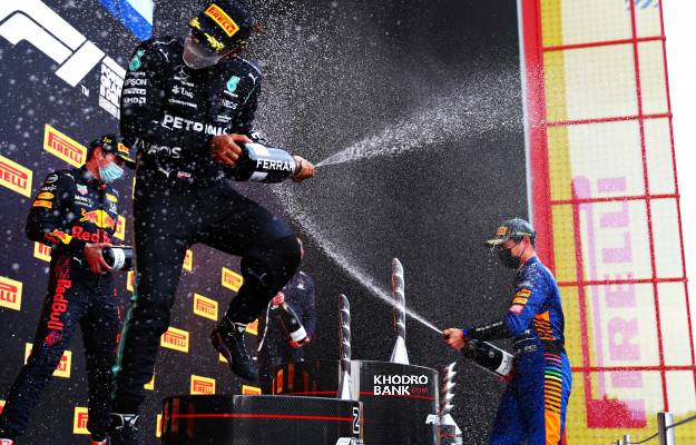 شادی همیلتون و ورشتپن بر روی سکوی بحرین 2021