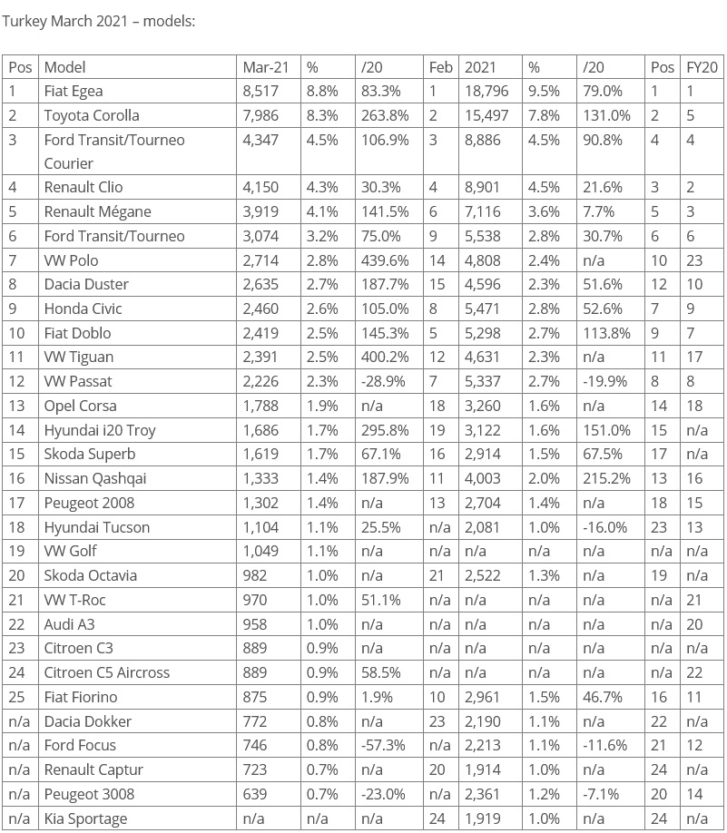 پرفروش ترین برندهای ماه مارس 2021 ترکیه در بین خودروهای فروخته شده، جایگاه برندها کمی جابجا شده و به ترتیب می توان خودروی فیات Egea، تویوتا کرولا، فورد ترانزیت، رنو کلیو و در نهایت رنو مگان را 5 خودروی پرفروش بازار ترکیه در ماه مارس 2021 معرفی کرد که جزییات فروش آنان به طور کامل در جدول زیر آمده است.