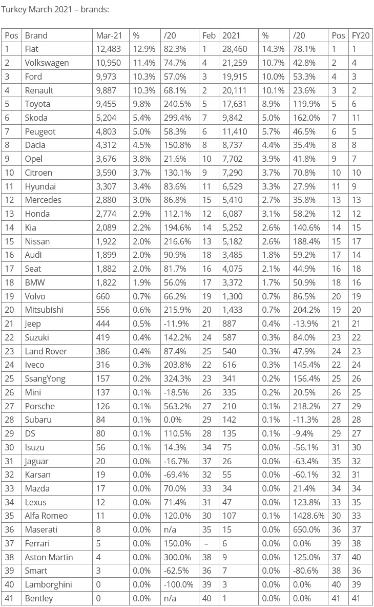 5 برند پرفروش در ماه مارس 2021 کشور ترکیه را می توان به ترتیب فیات، فولکس واگن، فورد، رنو و تویوتا معرفی کرد که به ترتیب جایگاه اول تا پنجم را از آن خود کرده اند. شرکت خودروسازی فیات در مجموع فروش 12 هزار و 483 دستگاهی، شرکت خودروسازی فولکس واگن مجموع فروش 10 هزار و 950 دستگاهی، شرکت خودروسازی فورد مجموع فروش 9973 دستگاهی، شرکت خودروسازی رنو مجموع فروش 9887 دستگاهی و در نهایت تویوتا موفق شده مجموع فروش 9455 دستگاهی را در ماه مارس 2021 تجربه کند که جزییات بیشتر آن در جدول زیر آمده است.