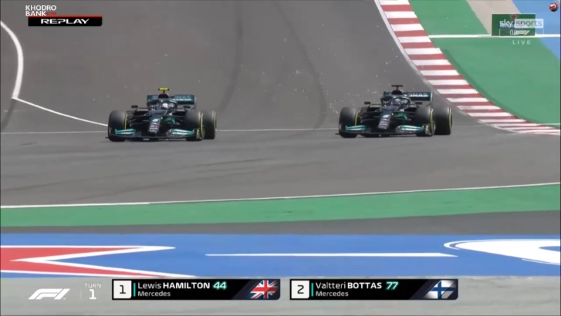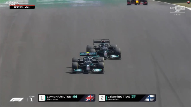 سبقت لونیس همیلتون از مکس ورشتپن در پیچ 1اما سومین سبقت کلاس درس لوئیس همیلتون برای هم تیمیاش والتری بوتاس بود. سبقت اول او از مکس از داخل پیچ 1 انجام شد اما این بار در همان محل منتهی از بیرون پیچ از بوتاس عبور کرد و به گونهای در مستقیمی و با استفاده از دیآراس شتاب گرفت که کمتر کسی پیش بینی میکرد بتواند در آن زمان از راننده فنلاندی عبور نماید.