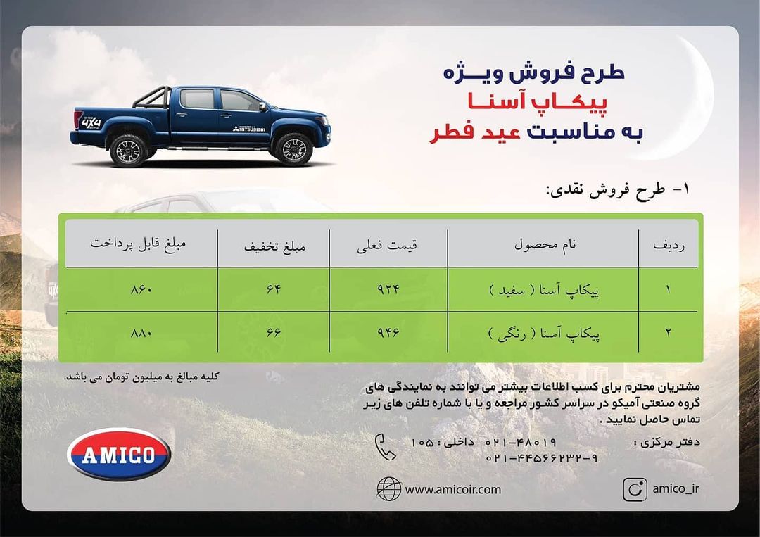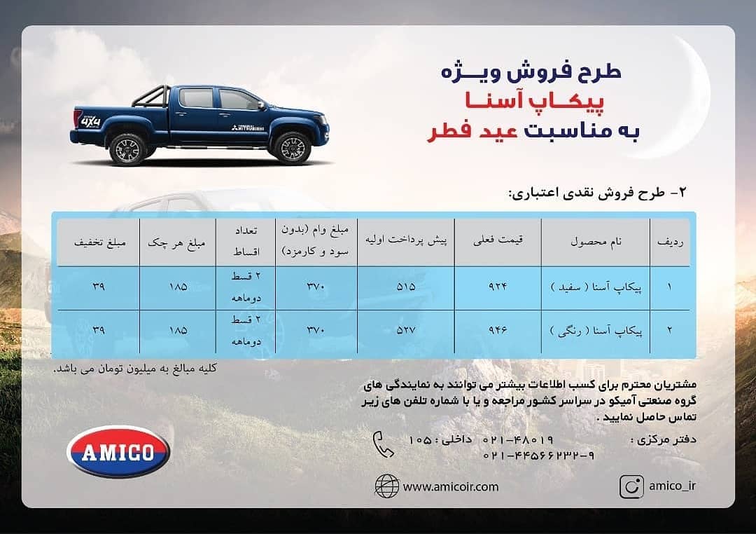 آمیکو به مناسبت عید سعید فطر، فروش ویژه ای برای پیکاپ آمیکو آسنا قرار داده که در آن تخفیف های ویژه ای را نیز در نظر گرفته است. آمیکو آسنا یک پیکاپ تولید داخل است که به موتور 2.4 لیتری تنفس طبیعی مجهز شده و می تواند حداکثر 143 اسب بخار در دور 6000 و 210 نیوتن متر در دور 4400 را تولید کند. این خودرو دو دیفرانسیل است و تجهیز آن به قفل اتوماتیک دیفرانسیل مزیتی برای قابلیت های آفرودی آن است.