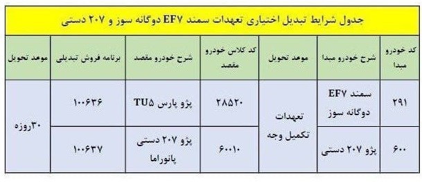 این بخشنامه از ساعت 10 صبح روز چهارشنبه 22 اردیبهشت ماه فعال شده و مشتریان می توانند در این طرح تبدیل بجای سمند دوگانه سوز EF7 خودروی پژو پارس TU5 دریافت کرده و همچنین بجای پژو 207 دستی، خودروی پژو 207 دستی پانوراما با موعد تحویل 30 روزه دریافت کنند که جزییات بیشتر آن در جدول زیر آمده است.