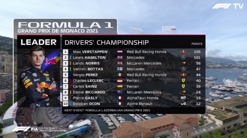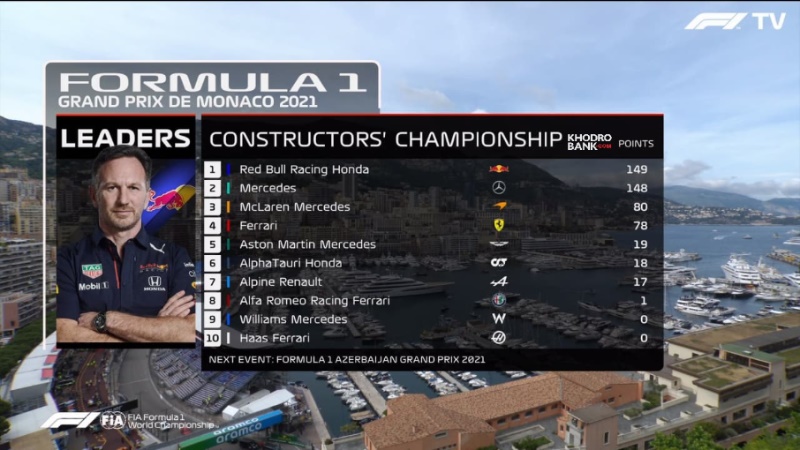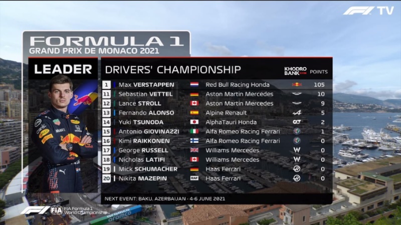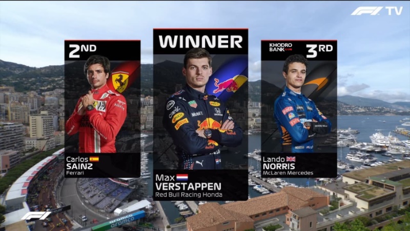 گرندپری موناکو با ناتوانی فراری در رساندن خودروی چارلز لکلرک که دیروز توانسته بود رده اول خط استارت را کسب نماید و در دور آخر تعیین خط به دیواره برخورد کرد، باعث شد ردبول با خیال راحت و بدون دغدغه مسابقه را آغاز نماید. مکس ورشتپن در همان ابتدا و قبل از ورود به پیچ یک مسیر والتری بوتاس را بست و امکان عبور به او نداد. همین کافی بود تا ورشتپن تا آخر پیشتاز بماند و در روزی که از لوئیس همیلتون تنها سایهای در پیست حضور داشت هم فاتح گرندپری موناکوی 2021 شود و هم پیشتازی در جدول رانندگان و هم با اختلاف یک امتیاز پیشتازی جدول سازندگان این فصل را بدست آورد. مکس برای اولین بار به افتخار صدر نشینی جدول رانندگان فصل در دوران فعالیت حرفهای خود رسیده است.