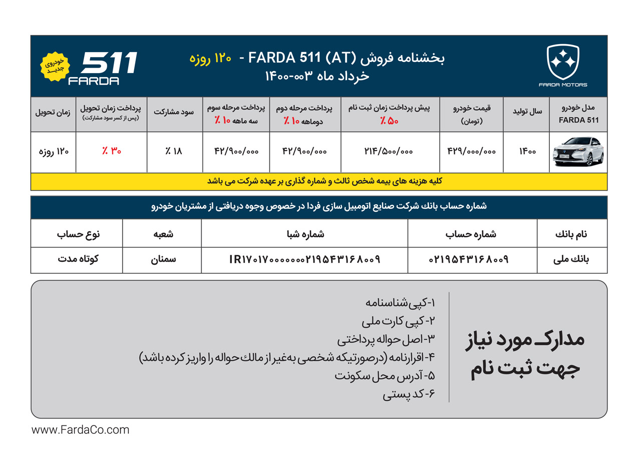 بخشنامه فروش فردا 511برای اطلاعات بیشتر در مورد این خودرو و شرایط فروش می توانید با دفتر مرکزی این خودروسازی به شماره 02148645000 تماس بگیرید.