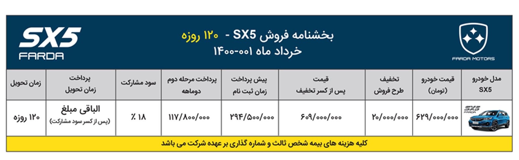شرایط فروش فردا SX5 با قیمت جدید از سوی خودروسازی فردا اعلام شد. در این شرایط فروش قیمت فردا SX5 معادل 629 میلیون تومان اعلام شده که پس از کسر تخفیف 20 میلیون تومانی، به 609 میلیون تومان کاهش یافته است.