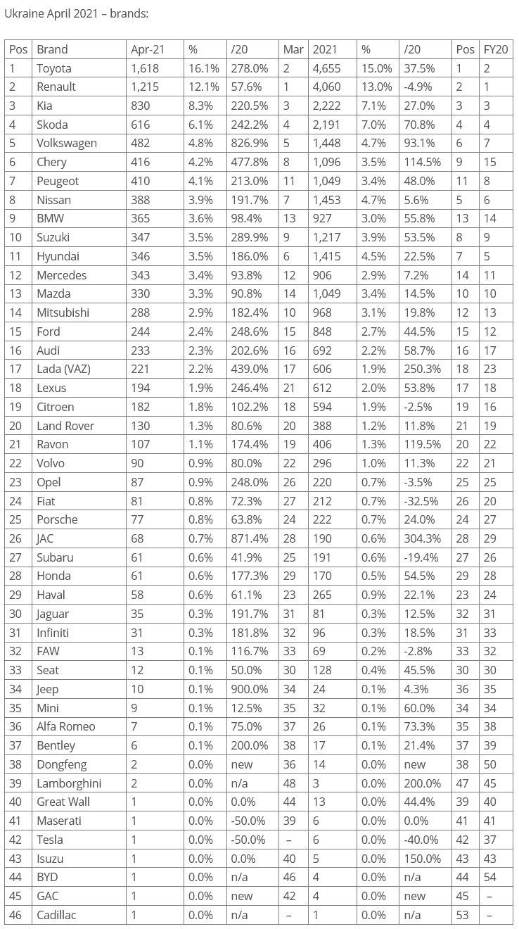 در رتبه بندی برندهای خودروسازی، کمپانی خودروسازی تویوتا رشد 278 درصدی فروش را تجربه کرده و توانسته 16.1 درصد از سهم فروش بازار اوکراین را برای خود داشته باشد و بعد از آن کمپانی خودروسازی رنو با رشد 57.6 درصدی دیده می شود، اما سهم آن با وجود افزایش فروش در بازار اوکراین کاهش پیدا کرده و از 13 درصد به 12.1 درصد رسیده است.
