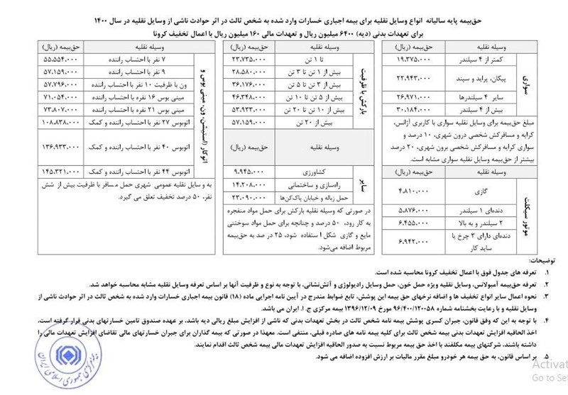 بیمه مرکزی هر سال، حق بیمه پایه بیمه شخص ثالث وسایل نقلیه زمینی را با توجه به نرخ دیه اعلام میکند. قوه قضاییه مبلغ دیه را برای سال 1400، در ماههای حرام 640 و در ماههای غیرحرام 440 میلیون تصویب نمود. حق بیمه پایه شخص ثالث خودروها و موتورسیکلتها را برای سال 1400 را در جدول زیر میتوانید ببینید.