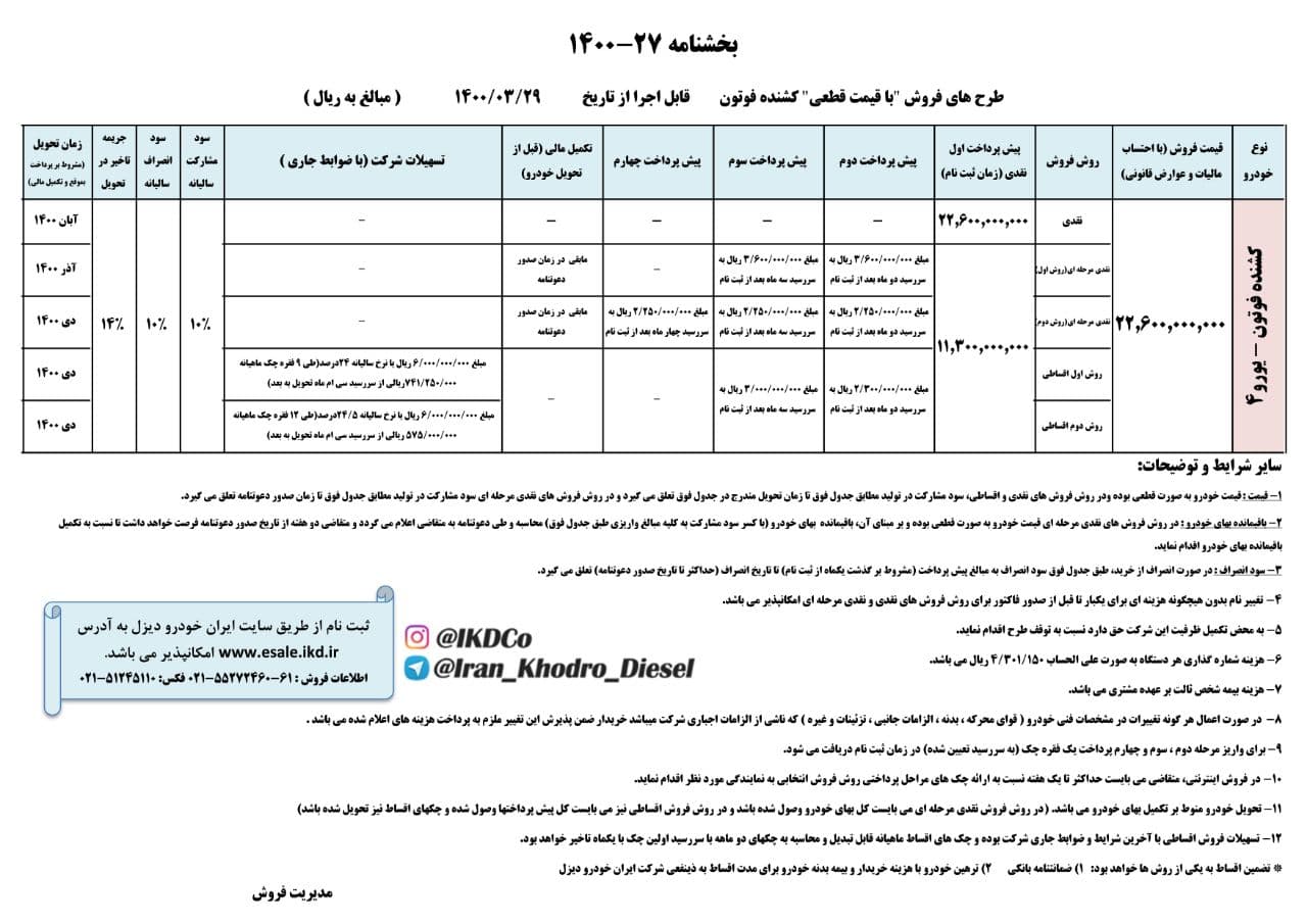 ایران خودرو دیزل در مرحله جدید فروش محصولات خود، فروش نقدی و اقساطی کامیون کشنده فوتون یورو 4 با قیمت قطعی را از امروز آغاز کرده و مشتریان می توانند در مدت زمان و تعداد محدود، این کامیون را ثبت نام و در آبان، آذر یا دی ماه 1400 بسته به شرایط فروش انتخابی تحویل بگیرند.