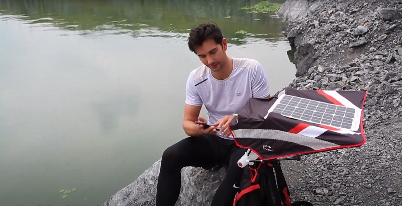 چتر تاشو به کوله پشتی متصل است و با فشردن دکمه، به راحتی باز شده و در ارتفاع تنظیم شده قرار میگیرد تا از فرد در برابر نور مستقیم و باران محافظت کند. وزن چتر حدود نیم کیلوگرم است و تا 99 درصد از نفوذ اشعه ماورای بنفش جلوگیری به عمل میآورد.