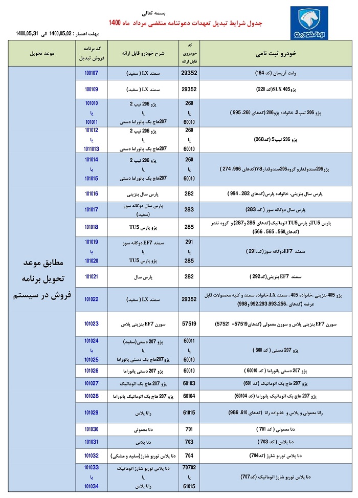گروه صنعتی ایران خودرو با تمرکز بر روی تعهدات منقضی مردادماه سال 1400 محصولات خود، به تازگی طرح تبدیل برخی از محصولات غیرقابل عرضه خود را آغاز کرده و مشتریان حداکثر تا پایان مردادماه سال جاری فرصت دارند خودروهای ثبت نامی غیرقابل عرضه خود را با خودروهای پیشنهاد شده از سوی ایران خودرو جایگزین کنند.
