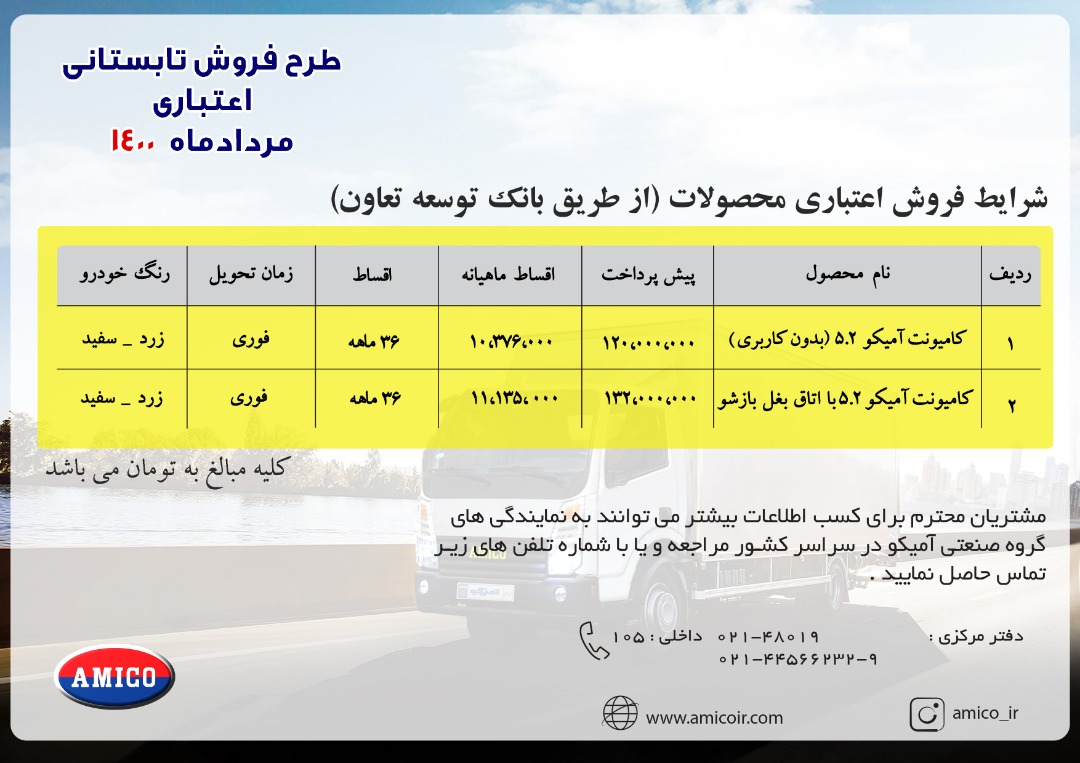 شرکت آمیکو شرایط فروش کامیونت 5.2 ویژه مردادماه را اعلام کرد. این شرایط اعتباری بوده و قیمت کامیونت در قالب 36 قسط پرداخت خواهد شد. فروش این کامیونت از طریق نمایندگیهای مجاز آمیکو صورت خواهد گرفت.