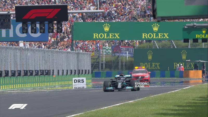 یک پیش آمد غیر منتظره استراتژی اشتباه مرسدس و تصمیم نادرست همیلتون معادله را کاملا تغییر داد و سرنوشت مسابقه به گونهای دیگر رقم خورد. سطح پیست تقریبا خشک شده بود و بر خلاف پبش بینی هواشناسی خبری از باران نبود پس همه به پیت رفتند تا لاستیکها تعویض نمایند و این همیلتون بود که تنها با لاستیک وت بر روی خط استارت ایستاد. چراغ قرمز خاموش شد، او حرکت کرد اما مسیر خشک بود و بسیار کند. نهایت تلاشش تنها او را 4 ثانیه جلوتر از دیگران که از داخل پیت استارت زده بودند قرار داده بود. تصمیم به تعویض لاستیک گرفت و این توقف باعث شد او در انتها یعنی ماشین چهاردهم به پیست بازگردد!