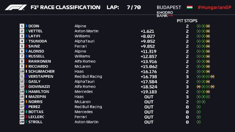 سکوی شگفت انگیز بوداپست، استبان اوکون از آلپین رده اول، سباستین فتل از آستون مارتین رده دوم و لوئیس همیلتون رده سوم گرندپری مجارستان را کسب کردند. مکس ورشتپن دهم شد. ویلیامز با هر دو ماشین امتیاز گرفت.