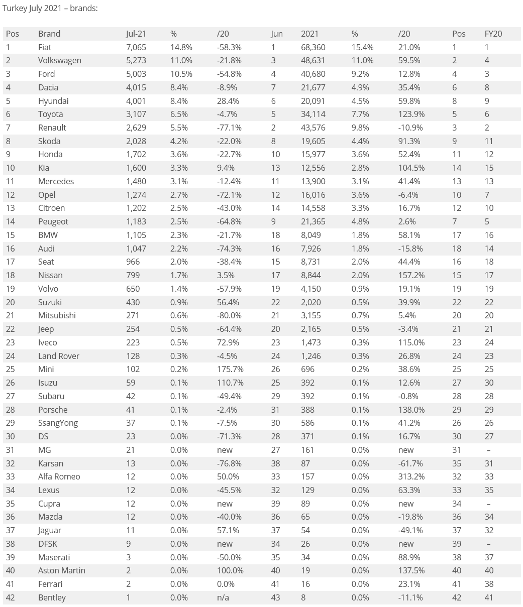 در ادامه می توانید نگاه دقیق و کامل تری به آمار فروش برندهای مختلف خودروسازی در کشور ترکیه برای ماه جولای 2021 داشته باشید.
