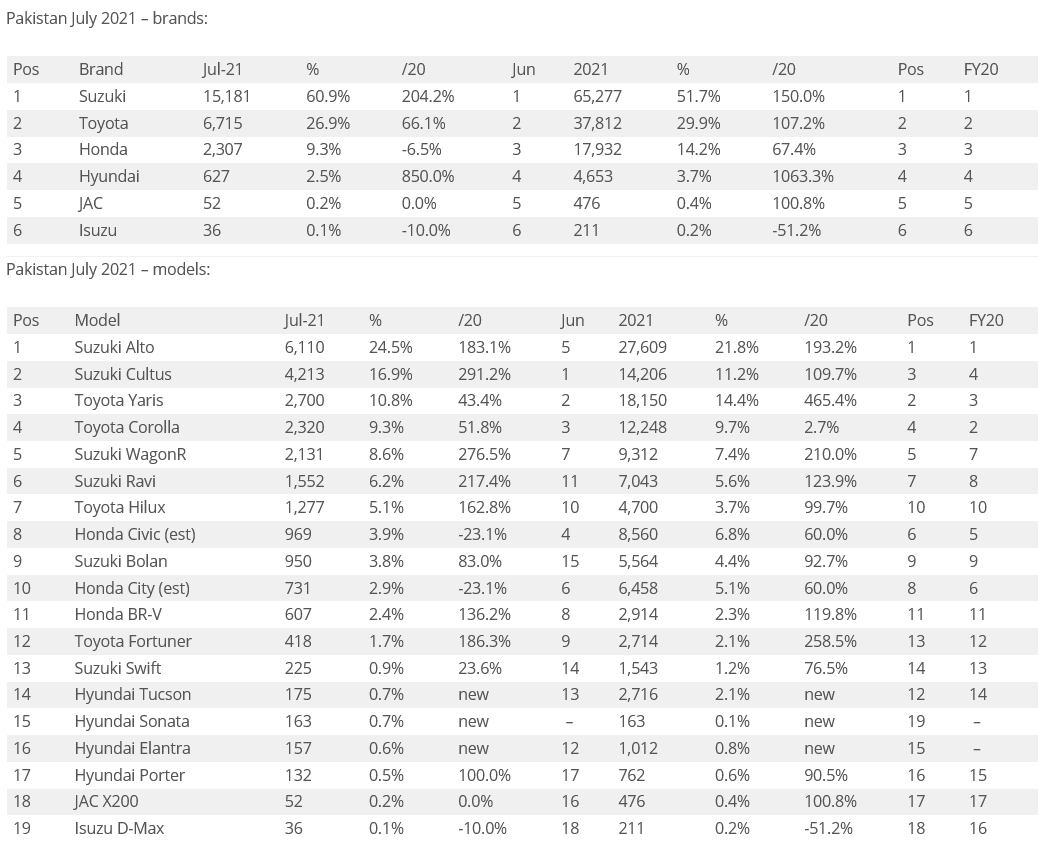 سال گذشته خودروی سوزوکی آلتو توانست پرفروش ترین خودروی بازار پاکستان لقب گیرد و حالا بررسی آمار فروش در ماه جولای 2021 میلادی نشان از برتری این خودرو در بازار پاکستان و تصاحب جایگاه نخست فروش دارد، هرچند در جایگاه دوم نیز محصول دیگر سوزوکی، یعنی خودروی سوزوکی کلتوس دیده می شود که با اختلاف زیادی نسبت به تویوتا یاریس در جایگاه دوم قرار گرفته است.