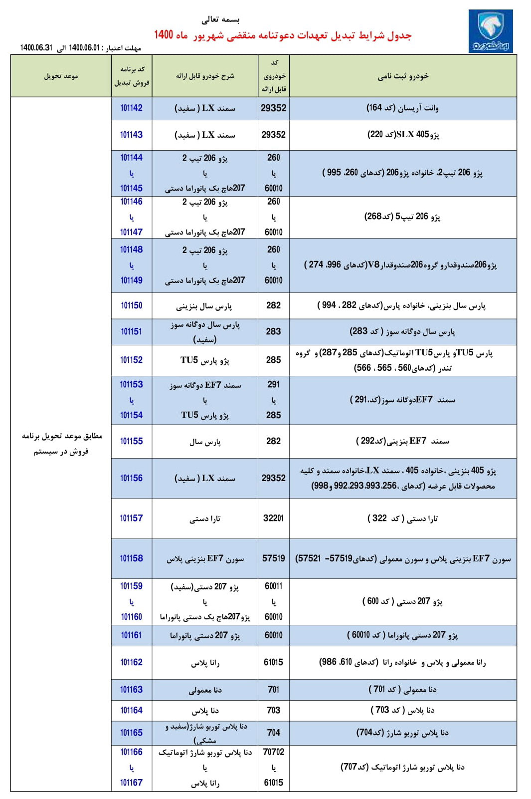 گروه صنعتی ایران خودرو با تمرکز بر روی تعهدات منقضی شهریورماه 1400 محصولات خود، اخیرا طرح تبدیل برخی از محصولات غیرقابل عرضه خود را آغاز کرده و مشتریان حداکثر تا پایان شهریورماه امسال فرصت دارند خودروهای ثبت نامی غیرقابل عرضه خود را با خودروهای پیشنهاد شده از سوی ایران خودرو جایگزین کنند.
