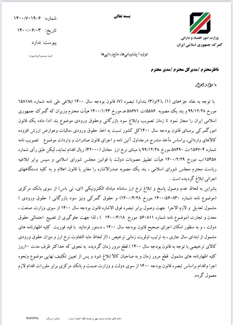 به موجب بخشنامه شماره ۱۴۰۰/۷۰۱۹۰۶ و اجراي جزء هاي ١، ٢ و ٣ بند (و) تبصره ٧ قانون بودجه سال ١٤٠٠ با لحاظ راي شماره ١٥٤٥٨ مورخ ۱۴۰۰/۰۲/۲۹ هيات تطبيق مصوبات دولت با قوانين مجلس شورای اسلامی، نرخ ارز محاسباتي جهت حقوق ورودي نرخ ارز (اي تي اس) ابلاغي از سوي بانك مركزي بود که بدین منظور مقرر شد جهت جلوگيري از تضييع حقوق دولت، كليه اظهارنامه هاي مشمول از ابتداي سال قطع مرور زمان شده و حداکثر ظرف مدت ١٠ روز به صاحبان كالا ابلاغ شود که این ابلاغ باعث سردرگمی تولید کنندگان شده است.