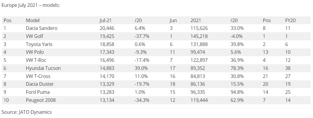 افتخار پرفروش ترین خودروی داچیا در ماه جولای 2021 میلادی به خودروی داچیا ساندرو با مجموع فروش 20 هزار و 446 دستگاهی تعلق می گیرد که با رشد فروش 6.4 درصدی موفق شده در جایگاه نخست فروش این ماه قرار گیرد. اما این اتفاق را باید مدیون کاهش تولید و فروش 37.7 درصدی فولکس واگن گلف بود و تنها با اختلاف 1000 دستگاهی و مجموع فروش 19 هزار و 425 دستگاه، در جایگاه دوم پرفروش ترین خودروی ماه جولای 2021 قرار گرفته است.