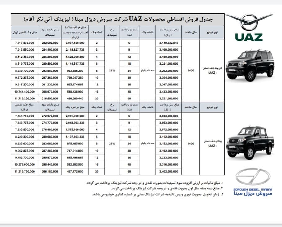 شرکت سروش دیزل مبنا با همکاری لیزینگ آتی نگر آفام، تصمیم دارد تا شرایط فروش اقساطی یواز پاتریوت و یواز پیکاپ را برقرار کند. در این شرایط فروش، یواز پاتریوت و یواز پیکاپ با دنده دستی و مدل 1400 به مشتریان عرضه شدهاند.