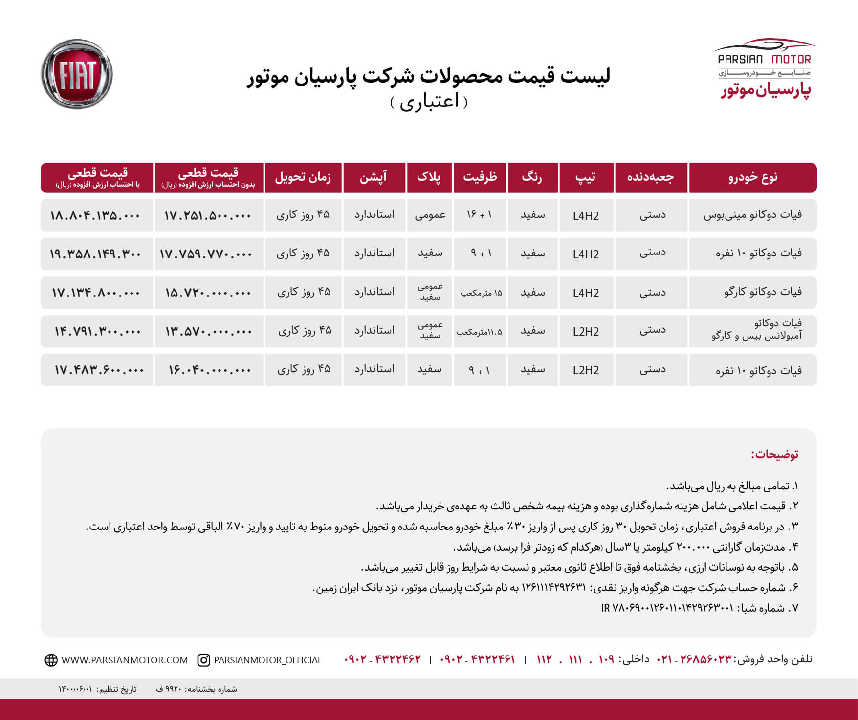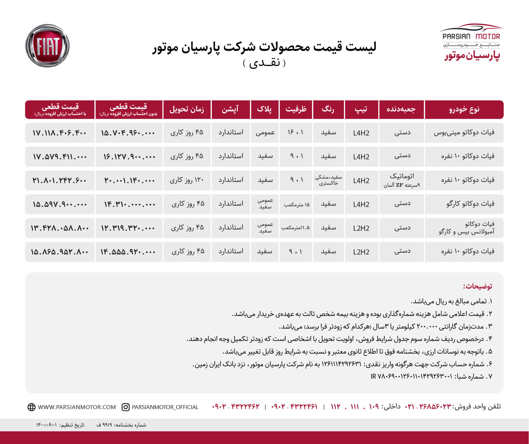 پارسیان موتور ویژه شهریورماه 1400، شرایط فروش نقدی و اعتباری فیات دوکاتو در مدل های مختلف مینی بوس، کارگو، ون 10 نفره و آمبولانس بیس را آغاز کرده و مشتریان می توانند با قیمت قطعی و موعد تحویل حداقل 45 روز کاری در مدل های دستی و حداکثر 120 روز کاری در مدل اتوماتیک، نسبت به ثبت نام یکی از مدل های ذکر شده اقدام کنند.