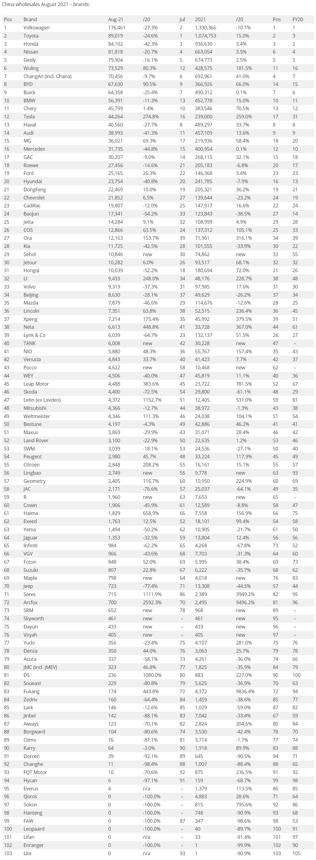 در بین پرفروش ترین برندهای خودروسازی فعال در بازار چین برای ماه اوت 2021 می توان به شرکت خودروسازی فولکس واگن اشاره داشت که در عمده فروشی های خود با مجموع فروش 176 هزار و 461 دستگاهی، توانسته با اختلاف دوبرابری در صدر جدول قرار گرفته و بالاتر از تویوتا با مجموع فروش 89 هزار و 19 دستگاهی یا شرکت خودروسازی هوندا با مجموع فروش 84 هزار و 102 دستگاهی قرار گیرد که جزییات بیشتر آن در جدول زیر آمده است.