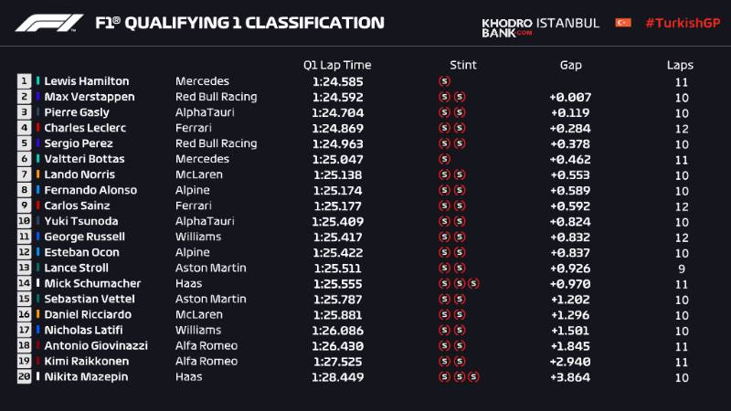 استانبول پارک ترکیه امروز برگزار کننده دور تعیین خط این مرحله از مسابقات فرمول یک بود. در شرایطی که تا پیش از این گرندپری، لوئیس همیلتون با اختلاف تنها 2.5 امتیاز با مکس ورشتپن ،یعنی: 246.5 امتیاز صدر نشین جدول رانندگان است او که به دلیل تعویض قطعات موتور در خط استارت فردا 10 رده جریمه خواهد داشت با توجه به هوای بارانی استانبول، باید در دور تعیین خط بسیار هوشمندانه و با استراتژی مناسب عمل میکرد تا رده بیشتری نسبت به رانندگان دیگر از دست ندهد.