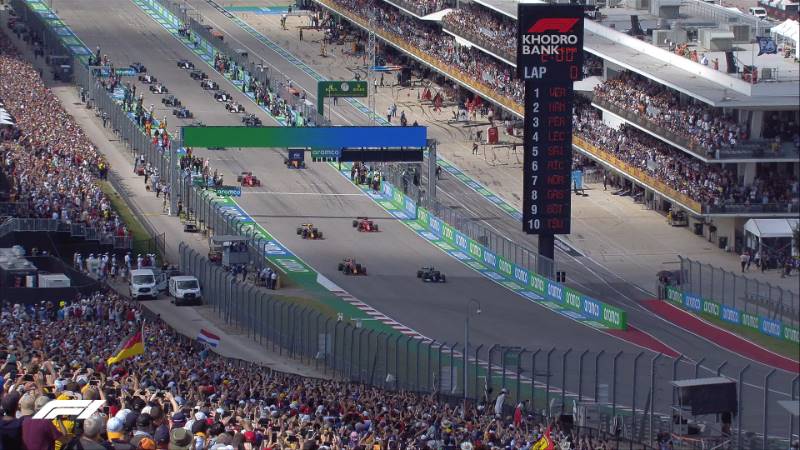 لوئیس همیلتون با یک استارت عالی و خیلی خوب با اختلاف تنها 0.03 ثانیه زمان سریعتر از مکس ورشتپن به پیچ اول رسید و رهبری مسابقه را بدست گرفت. همین مسئله سبب شد تا فرصت خوبی برای سرجیو پرز فراهم شود تا حملهای به جایگاه هم تیمیاش ورشتپن در رده دوم داشته باشد اما مکس دفاع کرد و اجازه نداد تا او عبور نماید و جایگاه خود را حفظ کرد. او نه تنها آن جایگاه را حفظ کرد بلکه به همیلتون هم اجازه نداد تا فاصله بیش از 1 ثانیه با او باز نماید و در تمام طول مدت رانندگی تا پیش از اولین توقف برای تعویض لاستیکها او در فاصله دیآراس همیلتون باقی ماند.