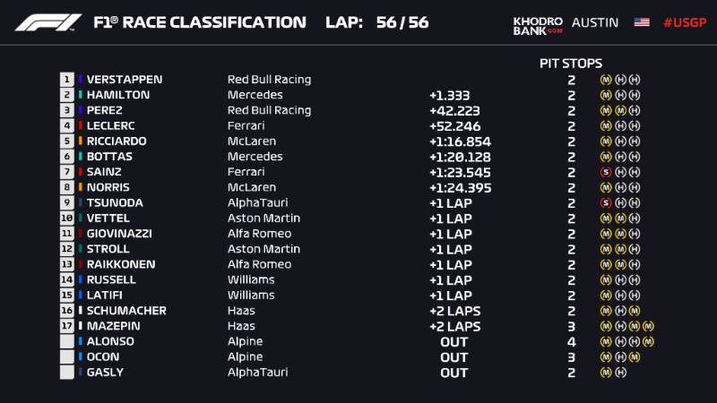 کیمی رایکونندر دور 54 و 55 همیلتون بارها به مکس نزدیک شد اما این کافی نبود در نهایت در دور آخر بعنی 56 او به فاصله زیر یک ثانیه رسید اما زمان کافی برای عبور از مکس نداشت و مکس ورشتپن برنده گرندپری آمریکا 2021 شد تا همیلتون کمکم احساس کند که قهرمانی این فصل و هشتمین عنوان را دارد از دست میدهد. بهترین راننده این مسابقه به انتخاب طرفداران مکس ورشتپن بود.در انتها رده بندی رانندگان در این مسابقه مطابق جدول زیر بود:
