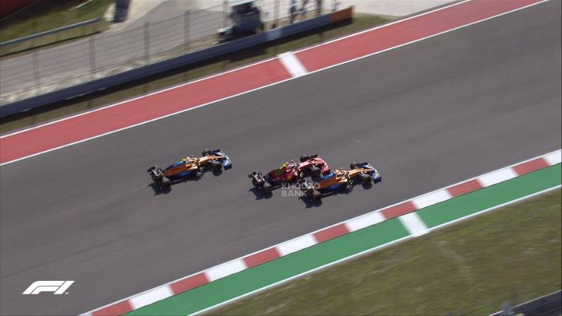 اما در همان ابتدا یک اتفاق رده خوب نیکلاس لطیفی را از او گرفت. مقصر این اتفاق کسی نبود جز لنس استرول که در پیچ یک بدور خود چرخید و دقیقا در مسیر لطیفی متوقف شد، همین امر سبب شد تا او ردههای زیادی را از دست بدهد و به رده 19 سقوط نماید. در همین دور نبرد زیبایی بین کارلوس ساینز، دنیل ریکاردو و لندو نوریس بر سر کسب رده 5 در گرفت، یک بار ریکاردو حمله کرد، ساینز دفاع کرد موقعیت برای نوریس فراهم شد و او از سمت دیگر از ریکاردو عبور کرد، اما در پیچ بعدی این ریکاردو بود که هم موقعیت خود را پس گرفت هم در یک حرکت خوب بلافاصله از ساینز هم رد شد و او را با هم تیمیاش، نوریس در نبرد بر سر رده 6 تنها گذاشت.