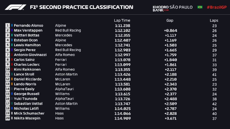 اما جلسه تمرین دوم هم برگزار شد و این بار آلپین و راننده اسپانیایی این تیم فرناندو آلونسو در صدر جدول ردهبندی تمرین قرار گرفتند. ناندوی دوست داشتنی در برزیل عکس معروفی دارد که مطمئنا همه علاقمندان به فرمول یک آن را به خاطر دارند. این عکس به زمانی بر میگردد که او راننده تیم مکلارن – هوندا بود که دوران موفقی برای این تیم و این راننده نبود. او بر روی یک صندلی راحتی دور از مراسم اهدای جوائز در آفتاب نشست و اعتراض خود را اینگونه به وضعیت تیم در آن زمان نشان داد. راننده دوم در این تمرین مکس ورشتپن بود و راننده سوم هم والتری بوتاس، پشت او هم تیمی آلونسو یعنی استبان اوکون قرار گرفت و همیلتون که دیروز سریعترین مرد برزیل بود در رده 5 ایستاد. سایر رانندگان مطابق جدول زیر این جلسه تمرینی را به پایان بردند.