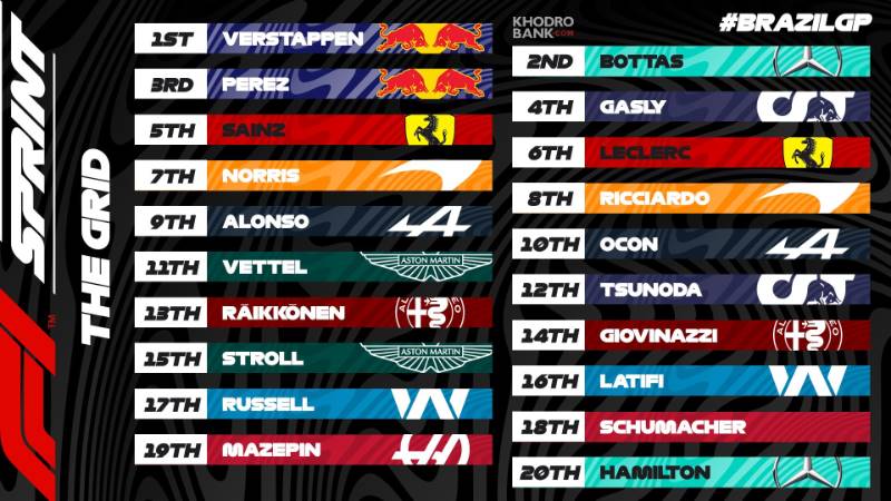 جدول ردهبندی رانندگان پس از تمرین دوم برزیل 2021اندکی پیش از شروع مسابقه سرعتی اولین رای در خصوص مکس ورشتپن صادر شد. او بخاطر نقض قوانین مستحق دریافت جریمه شناخته شد و بابت لمس خودروی مرسدس همیلتون باید 50هزار دلار پرداخت نماید. اما بلافاصله بعد از اعلام رای راننده هلندی ردبول، رای در خصوص تخلف تیم مرسدس نیز اعلام شد و لوئیس همیلتون از دور تعیین خط خارج شد. اصطلاحا دیسکوالیفاید شد. لذا او مسابقه سرعت را باید از انتها آغاز نماید. بنابراین با توجه به اتفاقات اخیر و جرایم اعلام شده، خط استارت مسابقه سرعتی به صورت زیر تغییر کرد: