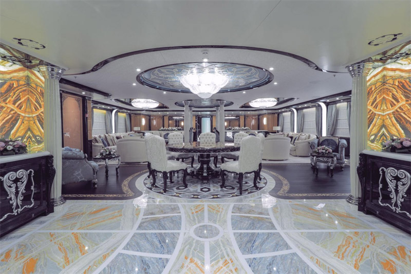 قایق تفریحی Elements دارای یکی از دیدنیترین و مجللترین فضاهای داخلی است. کریستیانو گاتو به عنوان طراح این غول آبی توانسته با استفاده از گرانترین متریال موجود، قایق را به یک قصر شگفتانگیز روی آب تبدیل کند. کف مرمری، سقف تزئین شده، لوسترهای بلوری، دیوار عقیق کاری شده و همینطور ریزهکاریهایی از جنس مروارید، همگی ظاهری لوکس و مجلل را به قایق شیخ فهد بخشیدهاند.