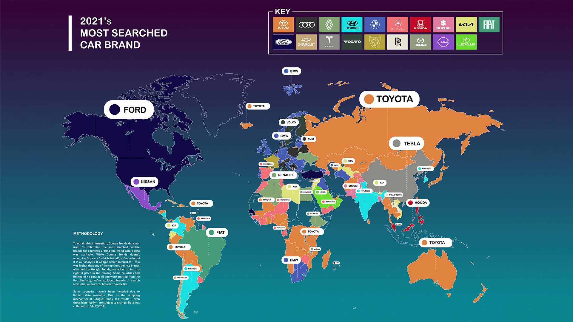 برای سال 2021، تویوتا به عنوان پرجستجوترین برند خودروسازی جهان شناخته شد. این برند پرجستجوی ترین برند خودرو در 47 کشور از 154 کشور بود که 31 درصد از نمونه را به خود اختصاص داد. بی ام و در 29 منطقه در رتبه دوم قرار گرفت و مرسدس بنز با 23 نمونه در رتبه سوم قرار دارد.