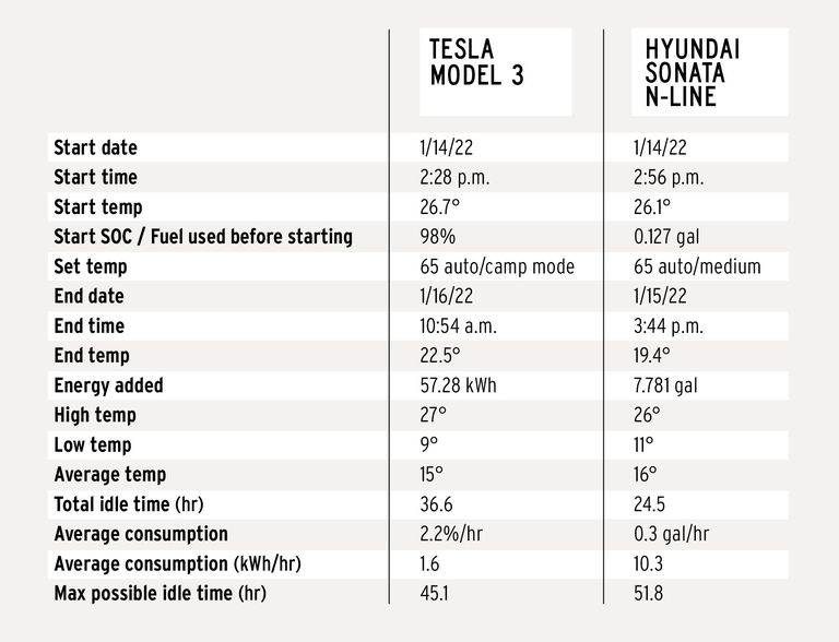 نتایج آزمایشتسلا مدل 3 به حالت کمپ مجهز است که سیستم تهویه را هنگام خاموش بودن خودرو، روشن و فعال نگه میدارد. در سوی دیگر در هیوندای سوناتا بایستی سامانه خاموش شدن خودکار سیستم تهویه غیرفعال میشد، چرا که این سامانه در صورت خاموش بودن خودرو پس از یکساعت یا نیم ساعت سیستم تهویه را خاموش میکند. همچنین وقتی خودرو خاموش است نمیتوانید دربها را قفل کنید و به همین دلیل چراغ کابین هیوندای سوناتا دائما روشن بوده است.