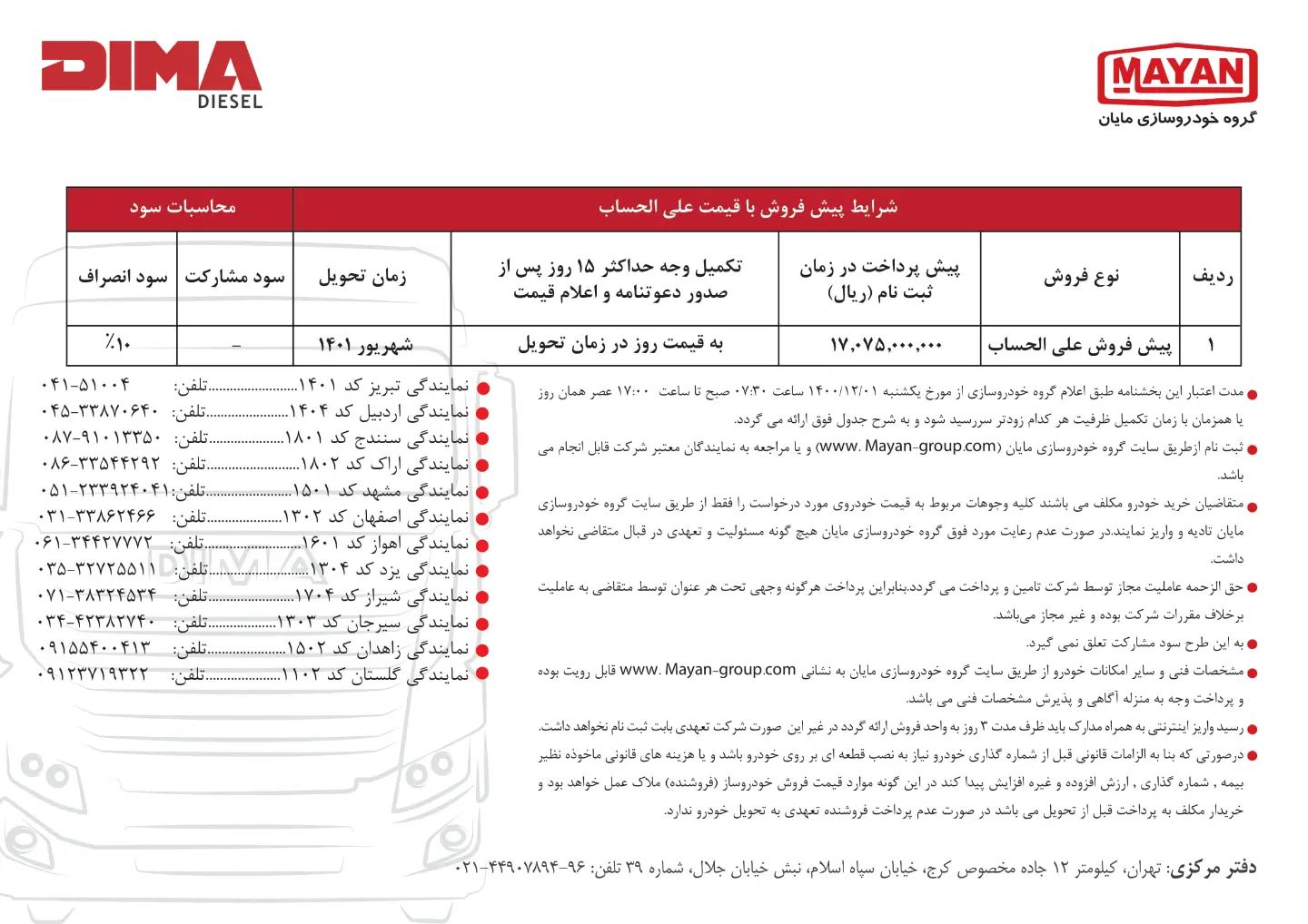 گروه خودروسازی مایان شرایط پیش فروش کشنده دیما را اعلام کرد. این شرایط از ۰۷:۳۰ صبح یکشنبه مورخ ۱ اسفند ماه لغایت ۱۷ عصر همان روز یا تا زمان تکمیل ظرفیت برقرار خواهد بود. متقاضیان برای شرکت در این شرایط بایستی پیش پرداختی معادل ۱۷,۰۷۵,۰۰۰,۰۰۰ ریال ارائه دهند و مابقی قیمت خودرو نیز در زمان تحویل کشنده از مشتری اخذ خواهد شد.