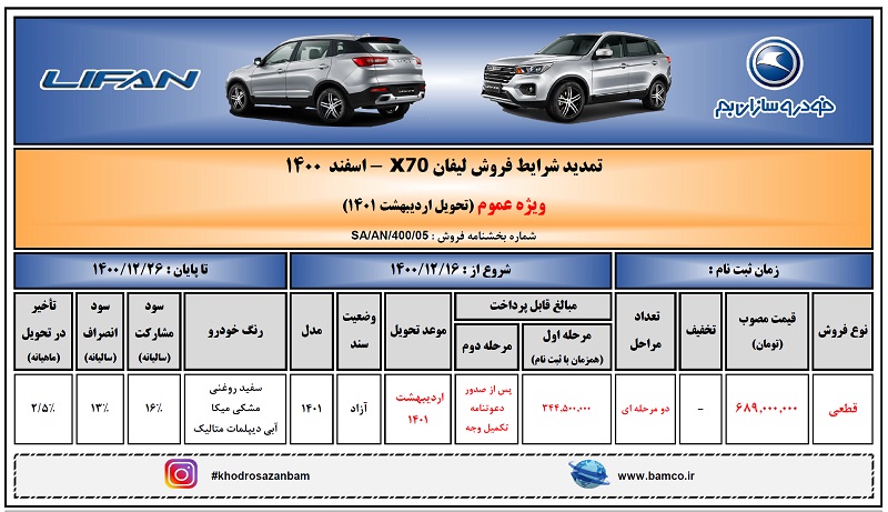 شرکت خودروسازان بم شرایط فروش لیفان X70 ویژه اسفندماه 1400 را تمدید کرد. در این شرایط فروش لیفان X70 با قیمت مصوب 689 میلیون تومان در اختیار مشتریان قرار گرفته است. نحوه پرداخت در شرایط فروش لیفان X70 به صورت دو مرحلهای است. مرحله اول همزمان با ثبت نام است و در آن 344 میلیون و 500 هزار تومان از مشتریان مطالبه میشود. مرحله دوم پرداخت نیز پس از صدور دعوتنامه خودروها خواهد بود. موعد تحویل خودروها نیز اردیبهشت 1401 عنوان شده است.