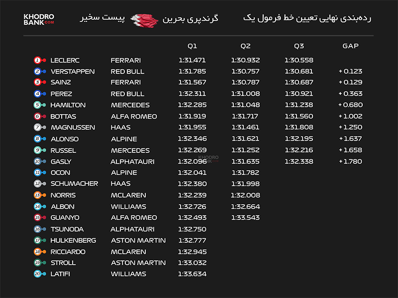 در تلاش دوم باز هم مرسدس اول شروع کرد و فراری در تعقیب آنها از پیت خارج شد. عنوان رده نخست خط استارت اولین مسابقه فصل 2022 با عملکرد کم اشتباه راننده موناکویی تیم فراری یعنی چارلز لکلرک به او رسید و توانست در خط 1 استارت گرندپری سخیر 2022 قرار گیرد. هم تیمی اسپانیایی او یعنی کارلوس ساینز سوم و مکس ورشتپن قهرمان جهان فصل پیش فرمول یک در رده دوم ایستاد. سایر ردهها به قرار جدول زیر است. زمان کسب شده توسط لکلرک 1:30.558 بود که از زمان پدروسا که در مسابقه در سال 2005 بعنوان رکورد پیست ثبت شده زمان سریعتری است اما آیا او در مسابقه خواهد تواسنت این رکورد را بشکند و زمان سریعی را به ثبت برساند؟ در گرندپری سخیر 2022 در روز یکشنبه 29 اسفند 1400 در خودروبانک با ما باشید. پیشا پیش سال نو بر همگی فارسی زبانان و هموطنان ایرانی در میهنمان و سراسر جهان فرخنده باد.