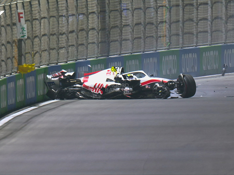 خودروی میک شوماخر پس از برخورد با دیواره گرندپری عربستان 2022