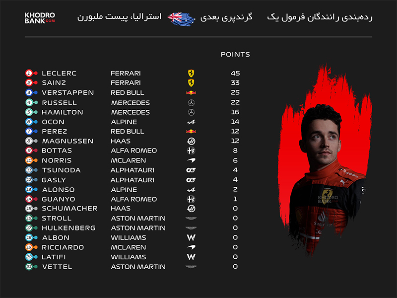 جدول ردهبندی رانندگان در فصل 2022