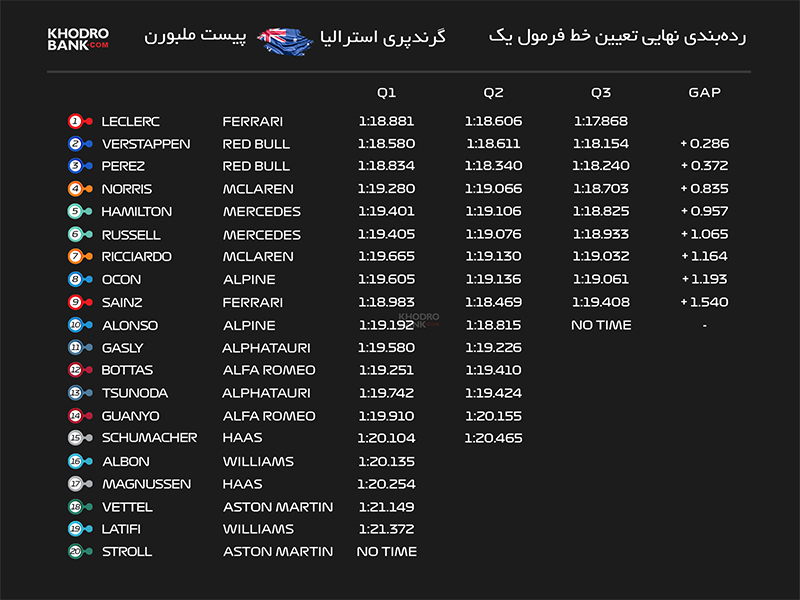 جدول ردهبندی رانندگان پس از جلسه دور تعیین خط گرندپری استرالیا 2022