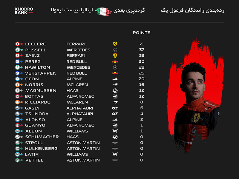 جدول ردهبندی رانندگان در فصل 2022