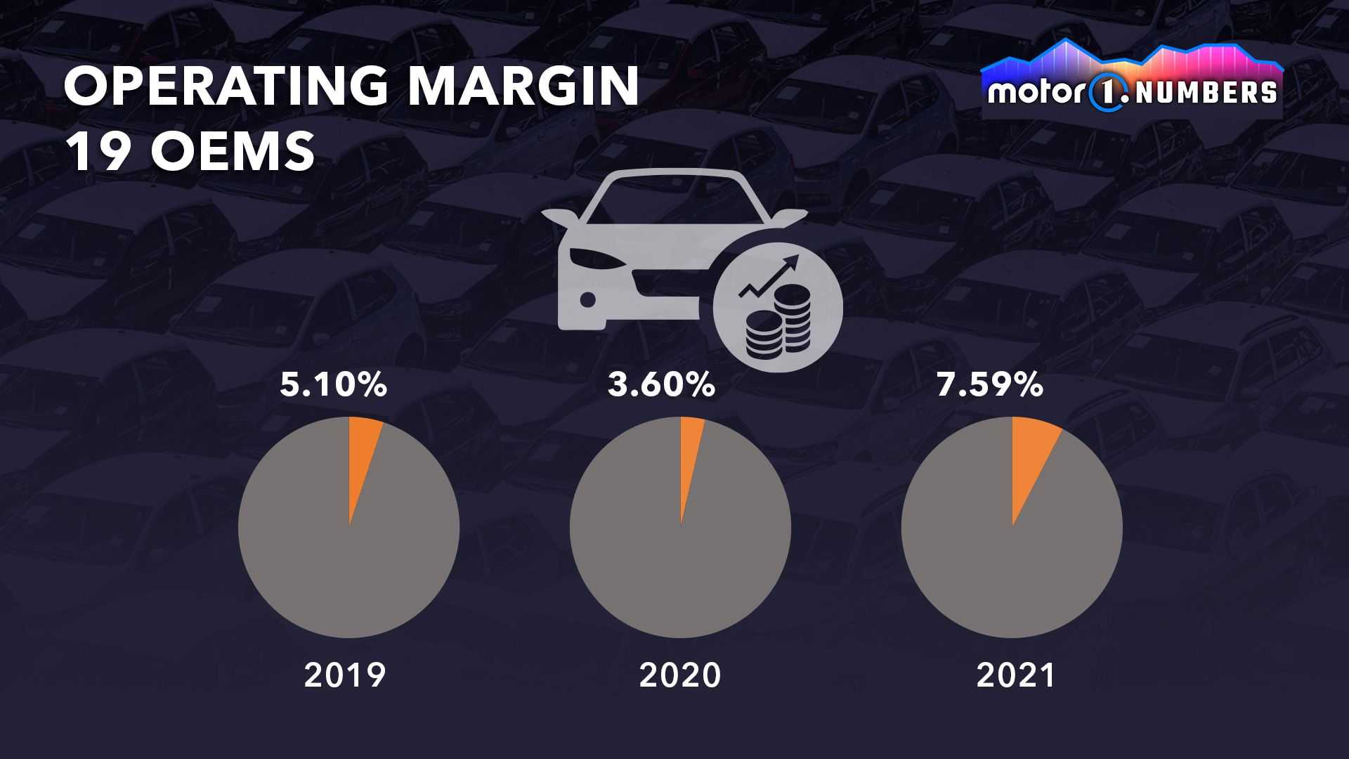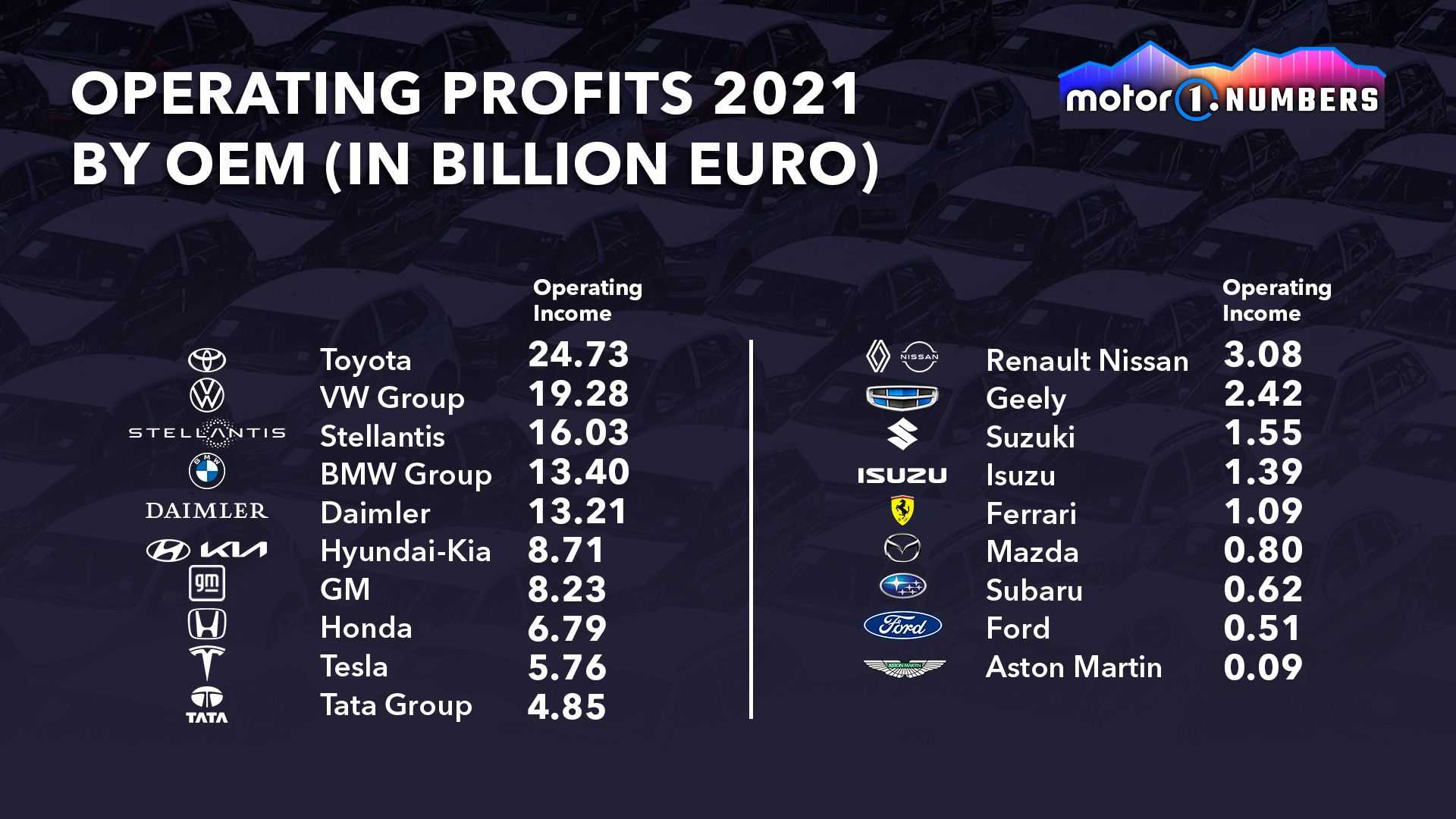 در این صورتهای مالی یک واقعیت جالب دیگر نیز آشکار شد. با وجود تأثیرات کرونا بر اقتصاد جهانی و مشکلات زنجیره تأمین ناشی از آن که صنعت خودرو را تحتتأثیر قرار داد، این ۱۹ شرکت خودروسازی در سال ۲۰۲۱ سود بیشتری نسبت به سال ۲۰۲۰ و ۲۰۱۹ کسب کردند. سود حاصل از عملیات شرکتها (درآمد کلی منهای هزینههای تولید و فروش/هزینههای اداری) در سال ۲۰۲۱ به ۱۴۳.۹۷ میلیارد دلار رسید.