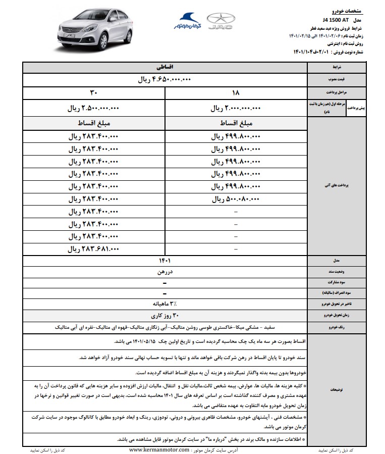 کرمان موتور شرایط فروش اقساطی جک J4 ویژه عید فطر را اعلام کرد. در این شرایط فروش قیمت جک J4 معادل 465 میلیون تومان اعلام شده است و مشتریان قادر خواهند بود با ارائه پیش پرداخت 200 الی 250 میلیون تومانی، این خودرو را به صورت اقساطی خریداری کنند. مدت بازپرداخت اقساط نیز 18 ماهه و 30 ماهه اعلام شده است.