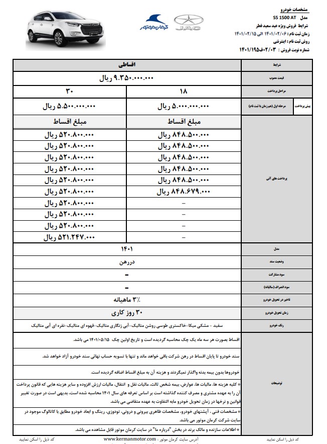 کرمان موتور شرایط فروش اقساطی جک S5 فیس لیفت ویژه عید فطر را اعلام کرد. در این شرایط فروش قیمت جک S5 نیوفیس معادل 935 میلیون تومان اعلام شده است و مشتریان قادر خواهند بود با ارائه پیش پرداخت 500 الی 550 میلیون تومانی، این خودرو را به صورت اقساطی خریداری کنند. مدت بازپرداخت اقساط نیز 18 ماهه و 30 ماهه اعلام شده است.