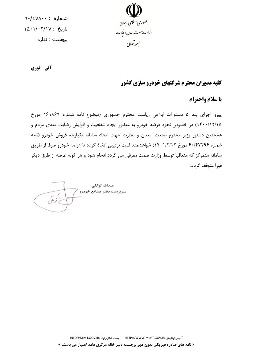 با توجه به اینکه برای انجام این فروش مجوز لازم به شماره 400/9526 از وزارت صمت دریافت شده بود، متاسفانه لحظاتی پیش از شروع زمان فروش، وزارت صمت ابتدا طی تماس تلفنی و پس از آن طی نامه شماره 60/47800 مورخ 1401/02/17 خواستار توقف فرآیند فروش گردید.