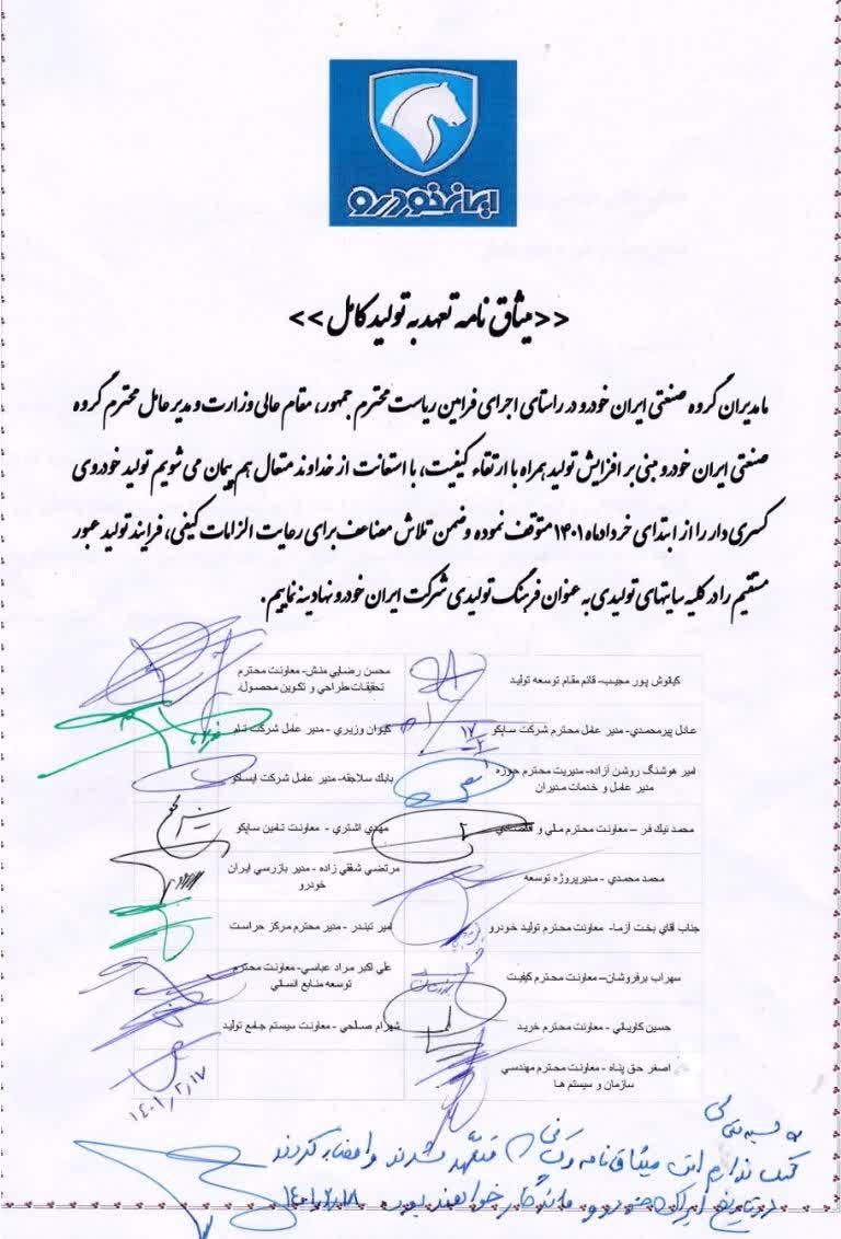 در میثاق نامه ای که به امضای مدیران ارشد گروه صنعتی ایران خودرو رسید، این خودروساز متعهد به تولید خودروی کامل و بدون کسری قطعه از ابتدای خردادماه شد.