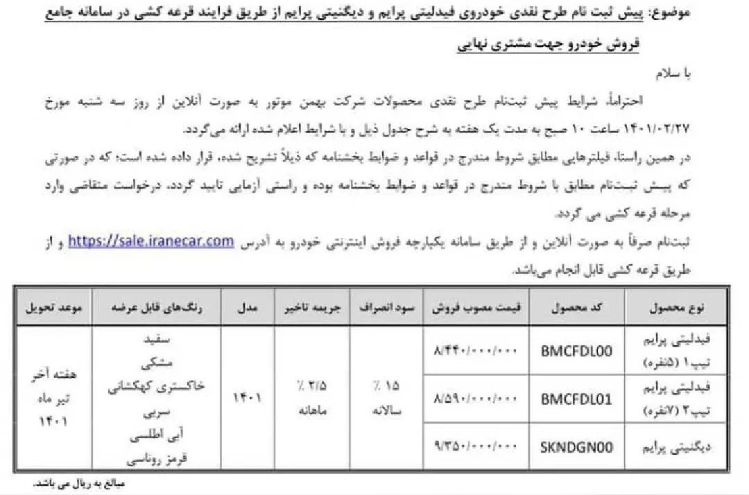در روز سه شنبه 27 اردیبهشت ماه ساعت 10 صبح، خودروهای فیدلیتی در دو نسخه 5 و 7 نفره و همچنین دیگنیتی با مدل 1401 و با موعد تحویل تیرماه از سامانه ذکر شده پیش فروش می شوند و همه متقاضیان می توانند ثبت نام کرده و در قرعه کشی شرکت کنند.