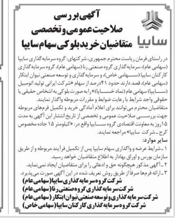 آگهی واگذاری ۴۱ درصد سهام سایپا اعلام و منتشر شد