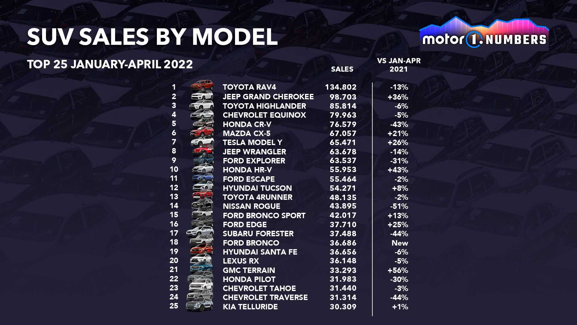 پرفروشترین شاسی بلندهای بازار آمریکا 2022در بازار ایالات متحده، شاسیبلندهای تویوتا از محبوبیت بسیاری برخوردار هستند. تویوتا راو 4 پرفروشترین شاسیبلند بازار آمریکا طی چهارماهه نخست سال 2022 بوده است و مدلهای دیگر این برند همچون تویوتا هایلندر و تویوتا فوررانر نیز در بین شاسیبلندهای پرفروش قرار گرفتهاند. بخش بزرگی از فروش گسترده شاسیبلندها در بازار آمریکا نیز به لطف تسلا مدل Y پدید آمده است.
