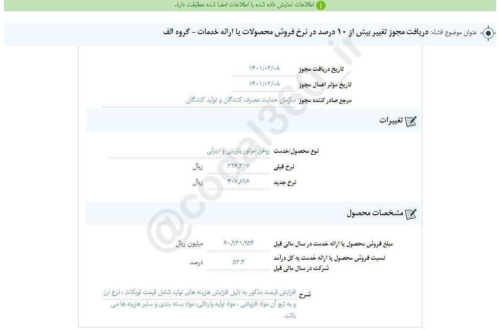 نامه‌ای که امروز از سوی انجمن پالایشگاه داران روغن سازی به رییس اداره نظارت بر ناشران گروه شیمیایی و غذایی ارسال شد، خبر از دریافت مجوز افزایش قیمت روغن موتور می داد اما درصد این افزایش در نامه عنوان نشده بود. با بررسی اسناد کدال مشخص شد سازمان حمایت مجوز افزایش 25 درصدی قیمت ها را به روغن سازان داده است.  دلیل این افزایش قیمت ، بالارفتن هزینه های تولید شامل قیمت لوبکات ، نرخ ارز و به تبع آن مواد افزودنی ، مواد اولیه وارداتی، مواد بسته بندی و سایر هزینه ها عنوان شده است‌. این درحالی است که بر اساس آنچه منابع آگاه اطلاع می‌دهند، عدد درخواستی تولیدکنندگان برای خروج از حاشیه ضرر و سر به سر شدن هزینه ها و درآمدها عددی بیشتر از این بوده که سازمان حمایت تنها با 25 درصد آن موافقت کرده است.